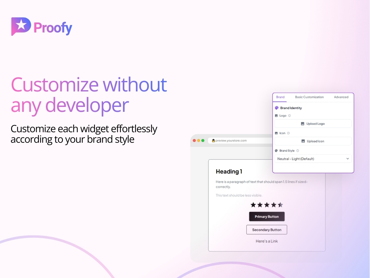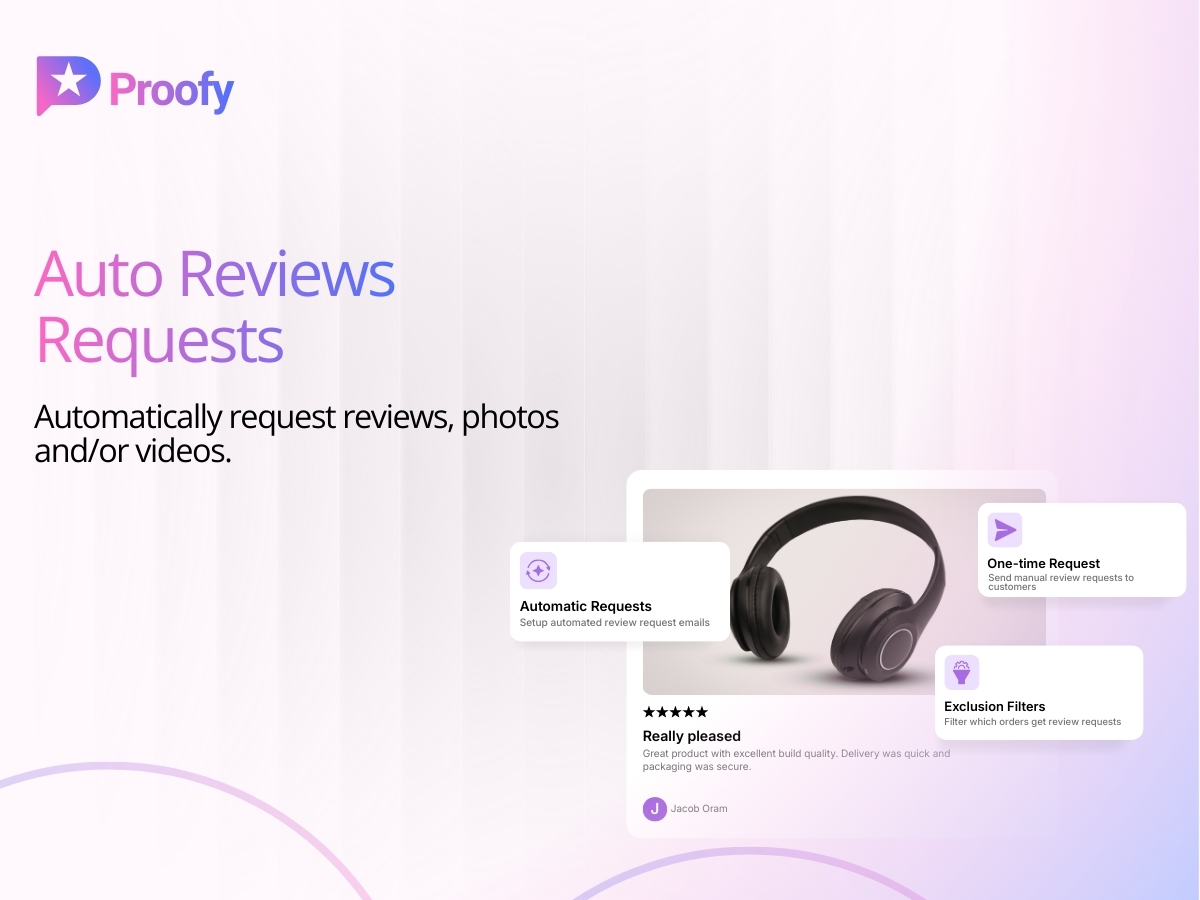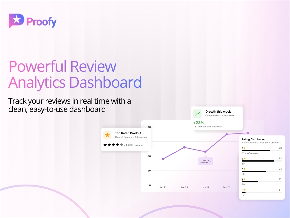 Proofy Reviews helps merchants collect, manage, and display product reviews to build trust and boost sales. Collect Reviews Automatically Send automated review request emails after every purchase. Set triggers (order created, paid, or delivered), add delays, and offer incentives like discounts or free shipping. 8 Beautiful Display Widgets Choose from All Reviews, Product Reviews, Testimonial Carousel, Media Gallery, Rating Banner, Floating Badge, and more. Customize fonts, colors, and layouts with live preview. Complete Review Management Approve, reject, reply, and bulk-manage reviews from one dashboard. Set auto-publish rules to control which reviews go live instantly. Photos & Videos Let customers upload images and videos with their reviews. Showcase user-generated content in stunning galleries that drive conversions. Analytics & Insights Track total reviews, average rating, review trends, and top-rated products with visual charts. More Features Import/export reviews via CSV, create manual review links, customize branding with style presets, group products together, and display verified review badges.