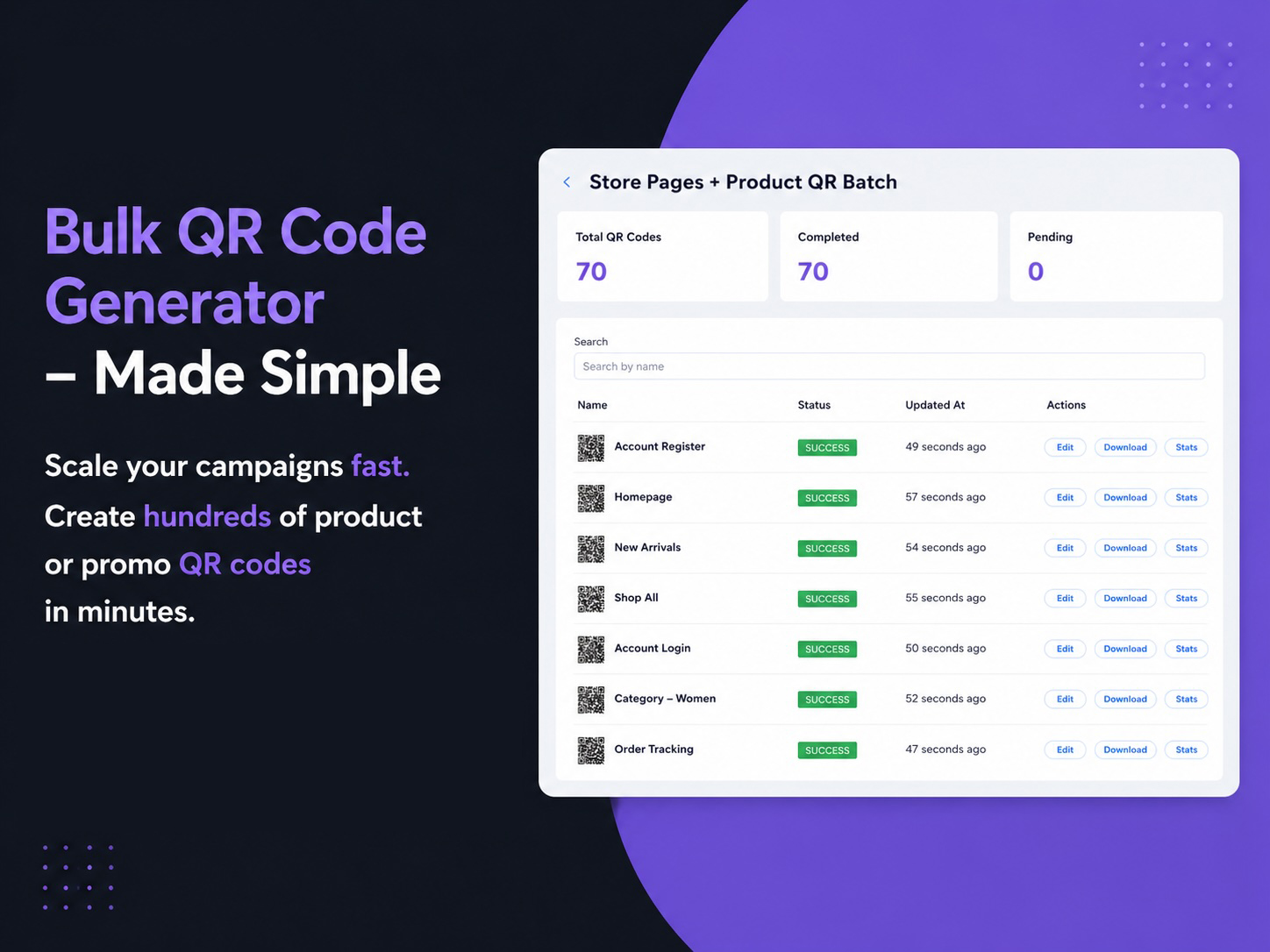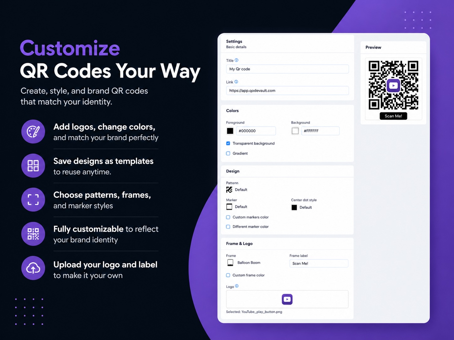 QR Code Generator App creates, manages, and provides analytics for dynamic or static QR codes with ease. Whether you’re creating custom QR codes for products, campaigns, or events, the QR Code App offers a seamless way to design, organize, and track them - all from one dashboard. With its intuitive interface, you can customize QR code styling, manage your entire collection, and access insights to enhance your marketing strategy.