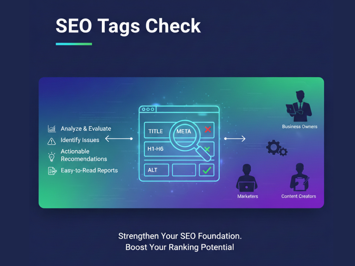 SEO Tags Check is a powerful on-page SEO auditing tool designed to help you analyze, evaluate, and optimize the essential tags that influence your ranking potential. Your title tags, meta descriptions, headers, and alt texts play a major role in how search engines understand your pages—and how users perceive them. SEO Tags Check scans your website and instantly identifies missing tags, duplicate metadata, weak descriptions, poorly structured headers, and images lacking alt text. It provides clear, actionable recommendations so you can strengthen your SEO foundation with confidence. This tool is ideal for business owners, marketers, and content creators who want quick insights without digging through code. Every scan includes a detailed breakdown of tag quality, length, keyword usage, and overall optimization status. With easy-to-read reports and instant rescans, you can monitor improvements and ensure your pages remain aligned with search engine best practices. Whether you’re optimizing existing content or preparing new pages for launch, SEO Tags Check helps you create a stronger, more search-friendly structure.