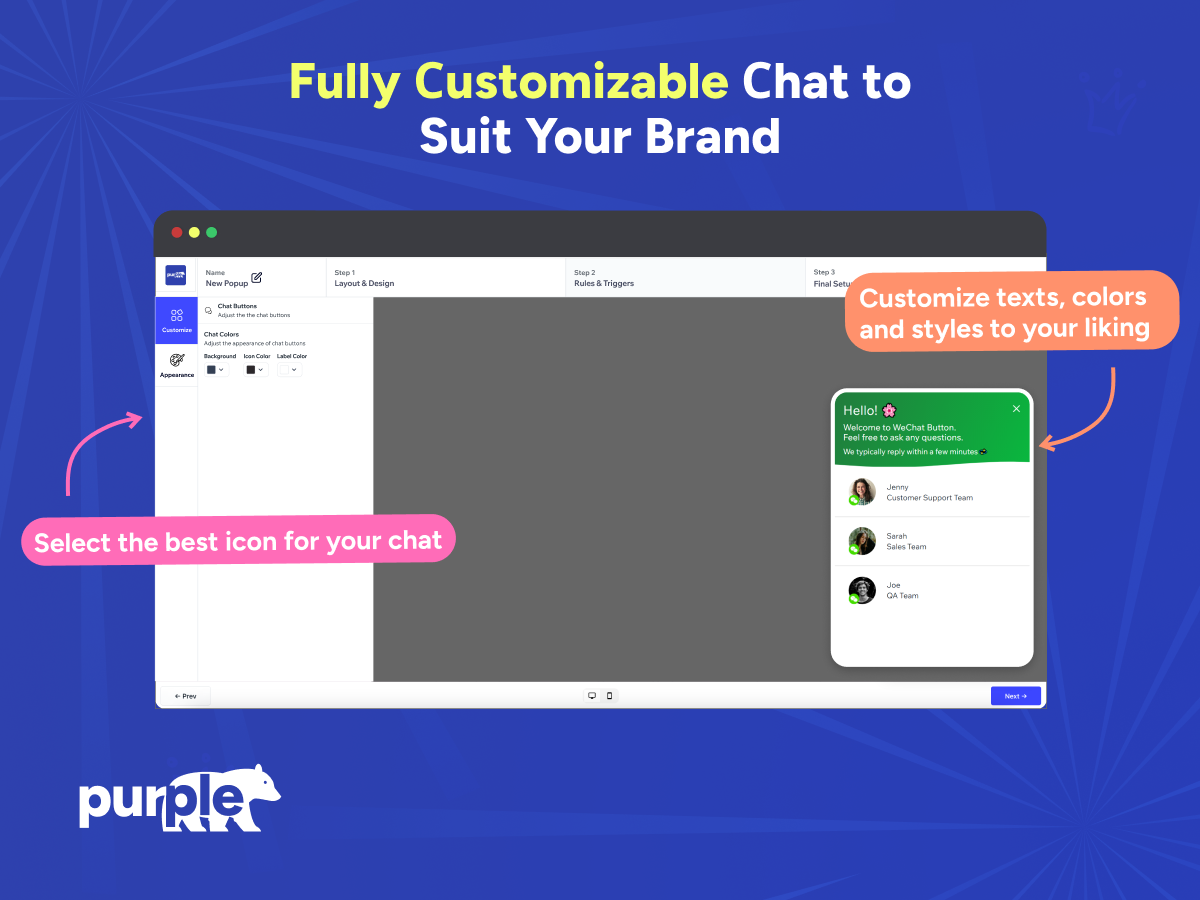 Fully Customizable Widget – Personalize the chat button’s icon, color, and message to match your branding