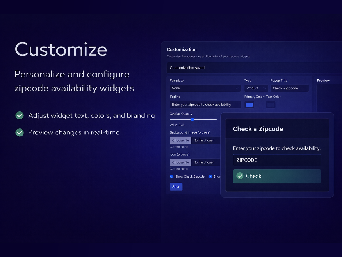Since the launch of online stores and bookings, one major challenge has remained clearly communicating location-based availability. Zipcode Checker & Validator is built to solve this gap. It allows your visitors to instantly verify whether a product or service is available in their location by entering their ZIP or PIN code. This prevents orders from unsupported areas, improves transparency, and helps customers make confident buying decisions while reducing confusion and cart abandonment. You can personalize the experience with custom messages for each ZIP code, including availability status, delivery notes, or localized text. Managing ZIP codes is simple and scalable. Upload them in bulk via CSV or add them manually through the dashboard. An optional product page widget enables customers to check availability directly where it matters most. The widget blends seamlessly with your store design and encourages interaction, increasing the likelihood of conversion. The zipcode checker can also be displayed anywhere on your site, including popups or lightboxes. All widgets are fully customizable to match your store theme.